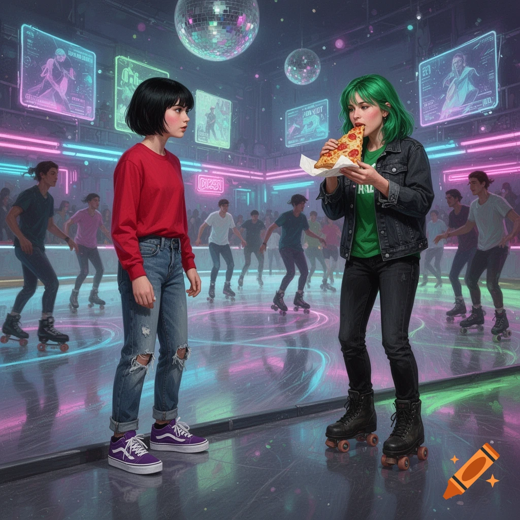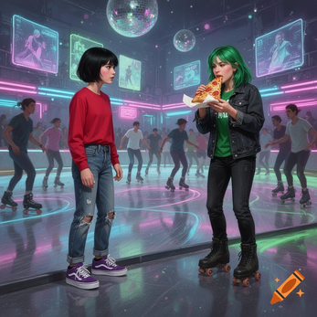 Hey, I'm Riley, the girl you play as in the game- Rink Mayhem. Rocking my red long-sleeve, ripped jeans, and purple sneaks, I'm all set to hit the roller rink. This place is the bomb -arcade games, a snack bar, and yeah, the tables are kinda gross. But whatever, it's where we all hang. Today's a blank slate; skate my brains out, smash some high scores, down a ton of pizza, or maybe finally talk to Cindy? That girl could be my future bestie; who knows?